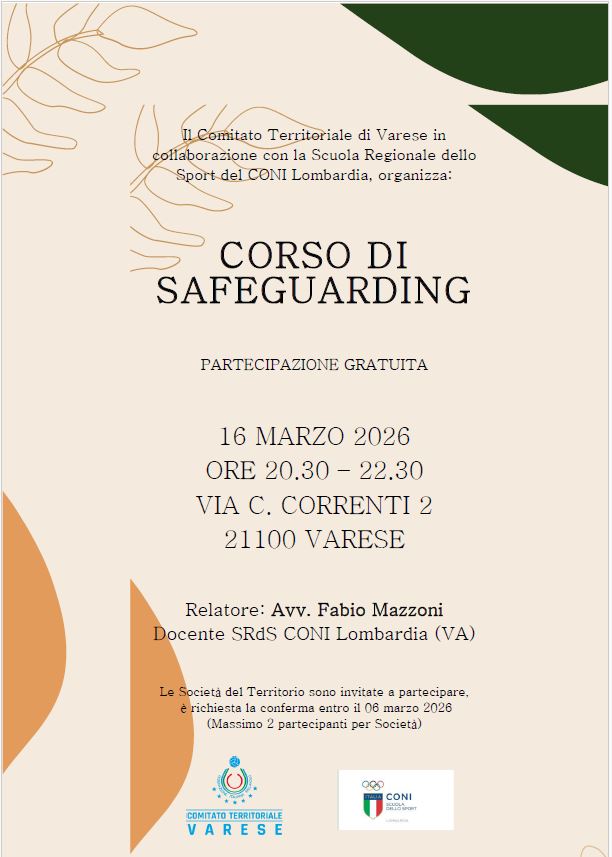 Il Comitato Territoriale in collaborazione con la Scuola Regionale dello Sport del Coni organizza per tutte le Società un corso per SAFEGUARDING